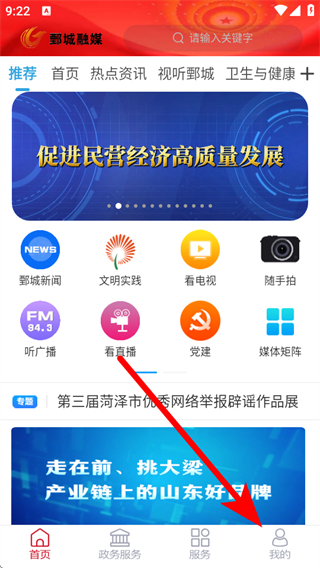 1、打開(kāi)鄄城融媒app,在首頁(yè)點(diǎn)擊我的,進(jìn)入個(gè)人的頁(yè)面。