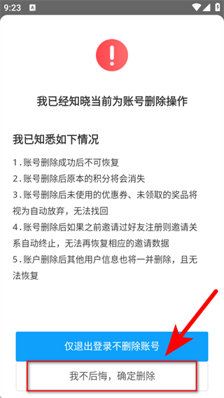 4、在注銷確認(rèn)頁(yè)面,點(diǎn)擊我不后悔,確定刪除,完成賬號(hào)注銷操作。