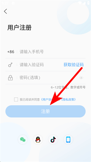 4、在用戶注冊頁面輸入手機號等信息,點擊注冊完成操作。