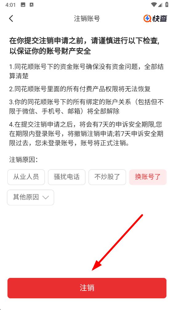 4、仔細(xì)閱讀注銷(xiāo)賬號(hào)的相關(guān)提示后,選擇注銷(xiāo)原因,點(diǎn)擊注銷(xiāo)按鈕,按照后續(xù)提示完成賬號(hào)注銷(xiāo)操作。
