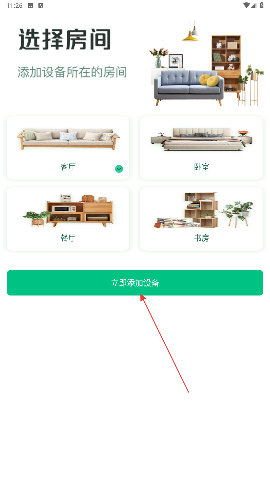 4、在選擇房間的頁面內(nèi),選擇客廳并點(diǎn)擊立即添加設(shè)備的按鈕即可。