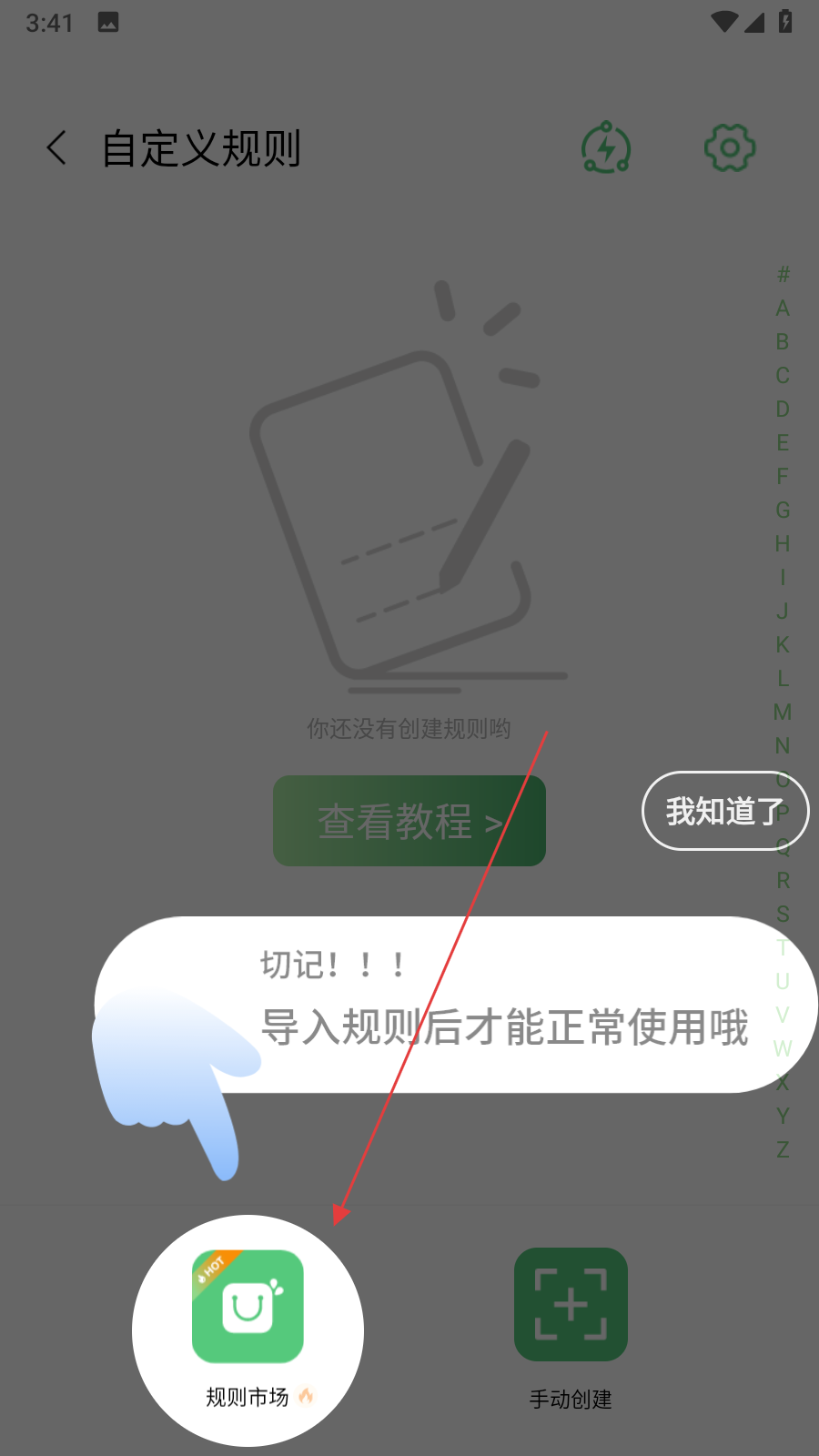 1、打開綠去廣告App進(jìn)入自定義規(guī)則界面,若沒有創(chuàng)建過規(guī)則,點(diǎn)擊規(guī)則市場(chǎng)圖標(biāo),進(jìn)入規(guī)則獲取頁(yè)面。