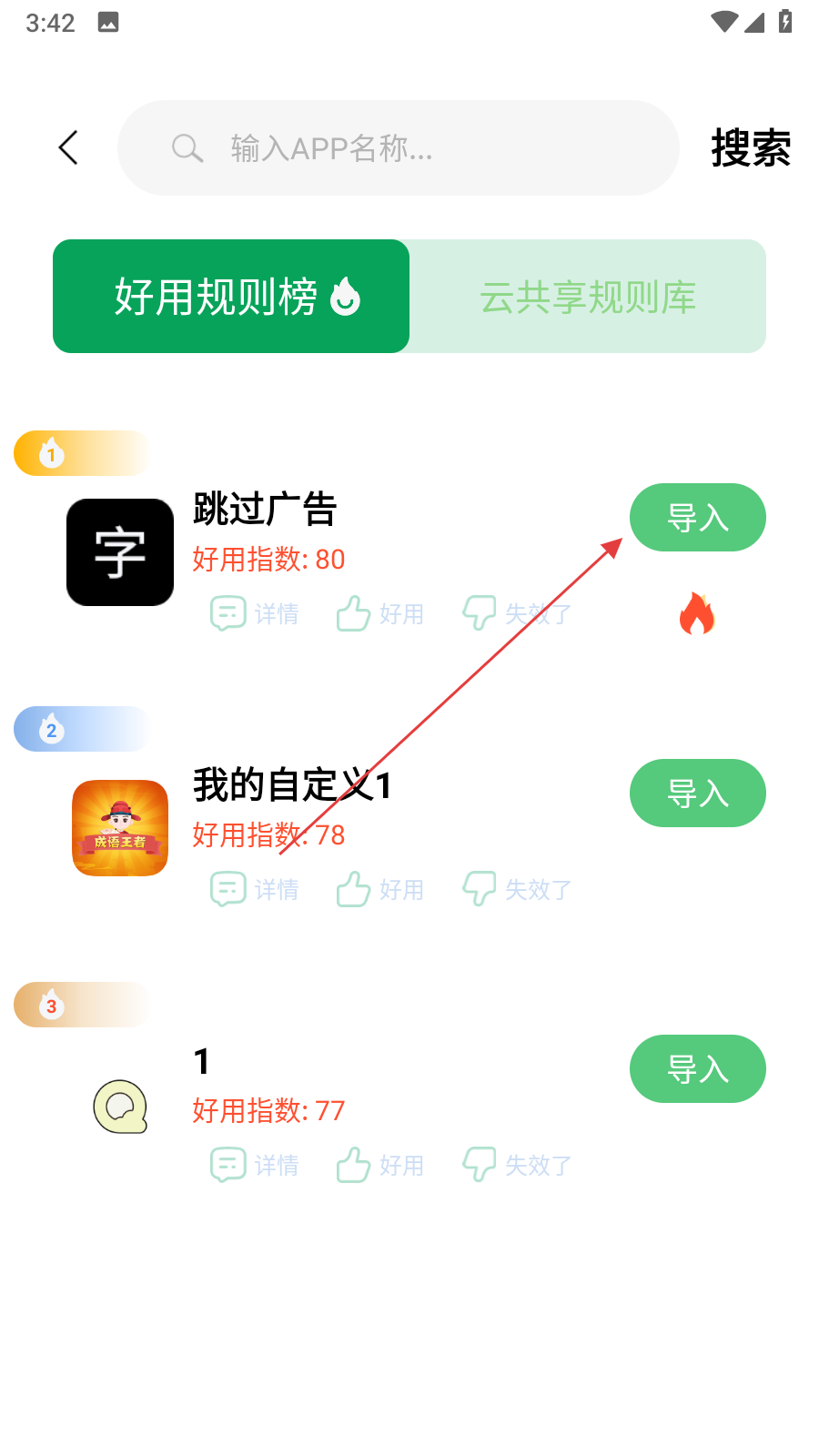 2、在規(guī)則市場(chǎng)中,能看到好用規(guī)則榜和云共享規(guī)則庫(kù),在好用規(guī)則榜里找到自己需要的規(guī)則,比如跳過廣告規(guī)則,點(diǎn)擊其右側(cè)的導(dǎo)入按鈕,將規(guī)則導(dǎo)入到App中。