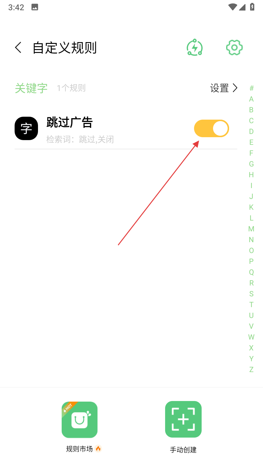 3、導(dǎo)入規(guī)則后,返回自定義規(guī)則界面,能看到已導(dǎo)入的規(guī)則,點(diǎn)擊規(guī)則名稱右側(cè)的開關(guān)按鈕將其開啟,這樣自定義規(guī)則就開始生效,后續(xù)打開相關(guān)應(yīng)用時(shí)便能按照規(guī)則執(zhí)行操作。