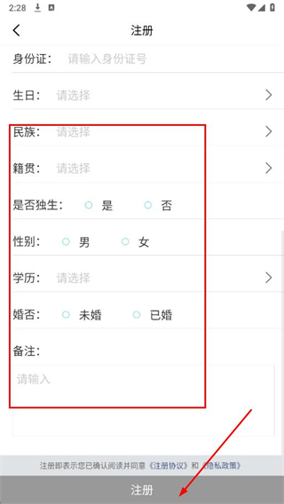3、繼續(xù)填寫民族、籍貫、是否獨(dú)生、性別、學(xué)歷、婚否、備注等信息。信息填寫完成后,點(diǎn)擊底部的注冊(cè),完成賬號(hào)注冊(cè)流程。