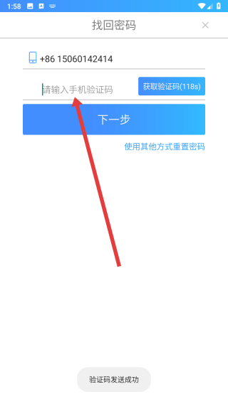 3、在點(diǎn)擊發(fā)送驗(yàn)證碼按鈕,等待后填寫驗(yàn)證碼,即可進(jìn)入到下一步驟。