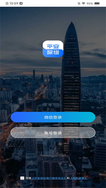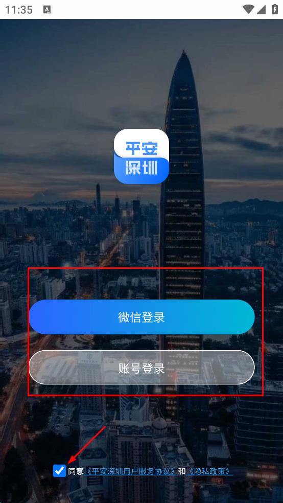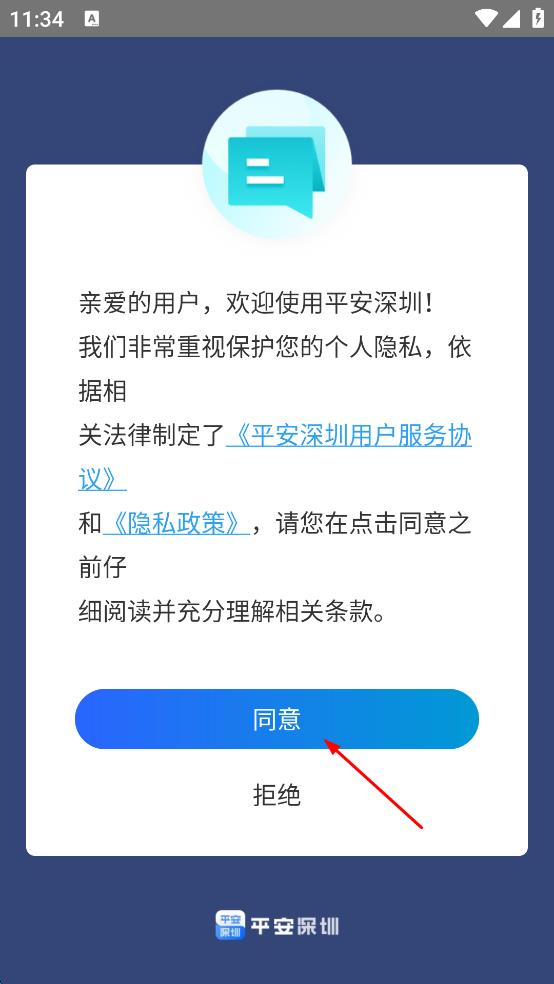 1、打開平安深圳APP,在彈出的用戶服務(wù)協(xié)議和隱私政策提示框中,仔細閱讀相關(guān)內(nèi)容后,點擊“同意”,進入登錄方式選擇頁面。