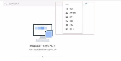 2、點擊“繼續(xù)”,在頁面右上角有兩個選項,分別是“創(chuàng)建”和“上傳”,點擊“創(chuàng)建”,可以發(fā)現(xiàn),我們可以新建“相冊”“共享相冊”“影片”等。下面我會以上傳照片為例,教大家使用google photos并創(chuàng)建屬于自己的相冊。