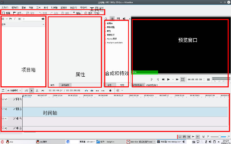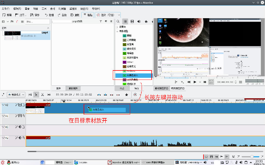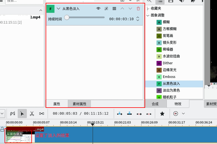為了視頻生硬,可以添加視頻效果。在kdenlive中,效果分為 淡入淡出效果 轉場效果 視頻效果 三種類型,每種效果的添加調(diào)整方法略有不同。