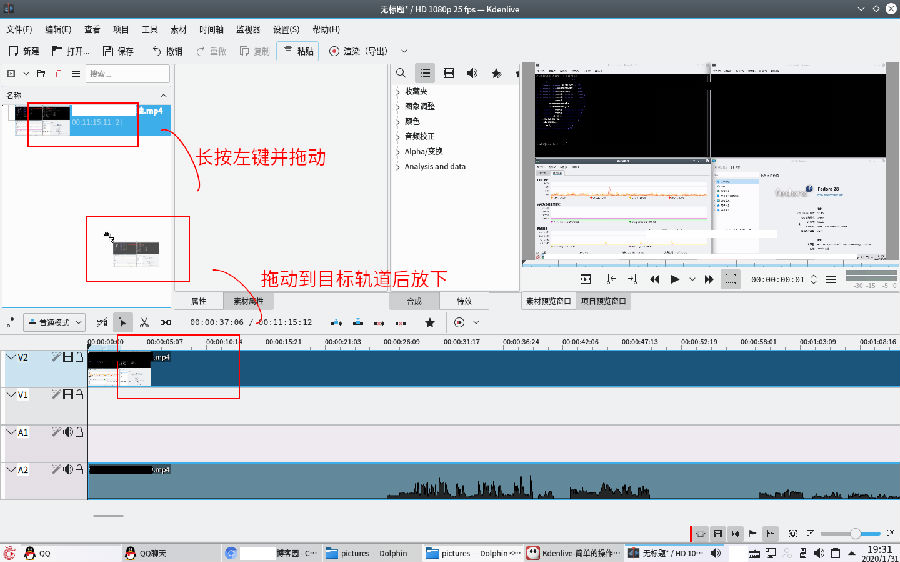 添加素材到時間軸時,先選中要添加的素材,按住鼠標不動,將素材拖動到目標軌道。