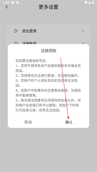 3、在設(shè)置界面中,點(diǎn)擊注銷賬號(hào)選項(xiàng),彈出注銷須知窗口。