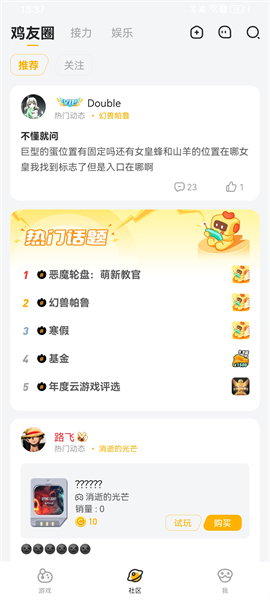 4、點(diǎn)擊社區(qū)【雞友圈】有超多網(wǎng)友發(fā)表問題看法等等,還有超多的熱門話題,用戶可以積極參與,一起探討;
