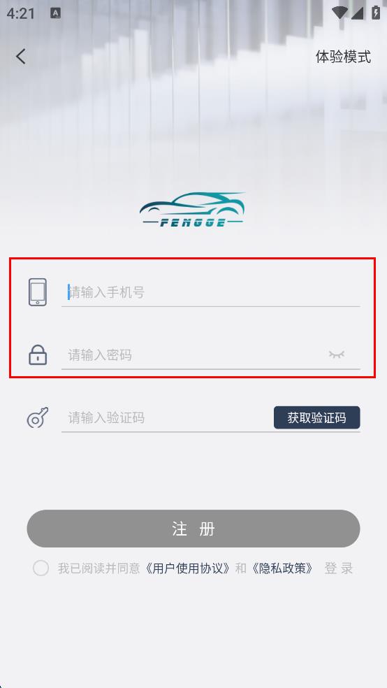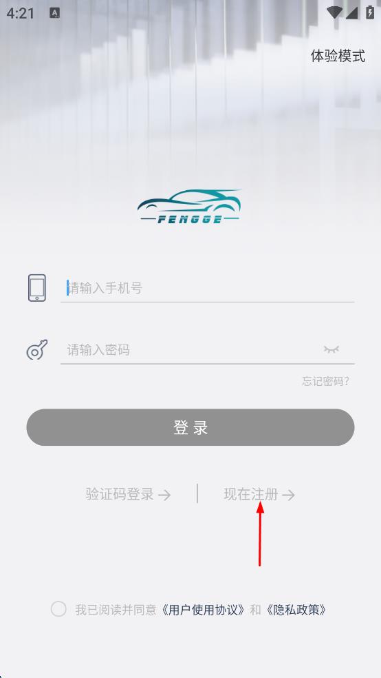 1、打開(kāi)“FENGGE”APP,在登錄界面點(diǎn)擊“現(xiàn)在注冊(cè)”選項(xiàng),進(jìn)入注冊(cè)頁(yè)面。