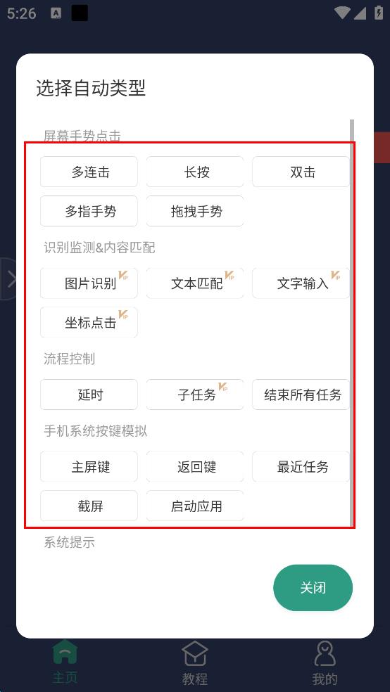 3、在自動化操作設置頁面,點擊添加選項,進入選擇自動類型頁面,可看到多連擊、長按、雙擊等多種自動類型選項。