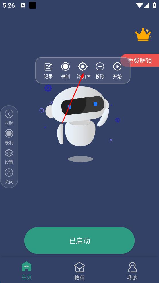 2、在APP主界面,點擊啟動按鈕,進入自動化操作設置頁面,可看到記錄、錄制、添加等功能選項。