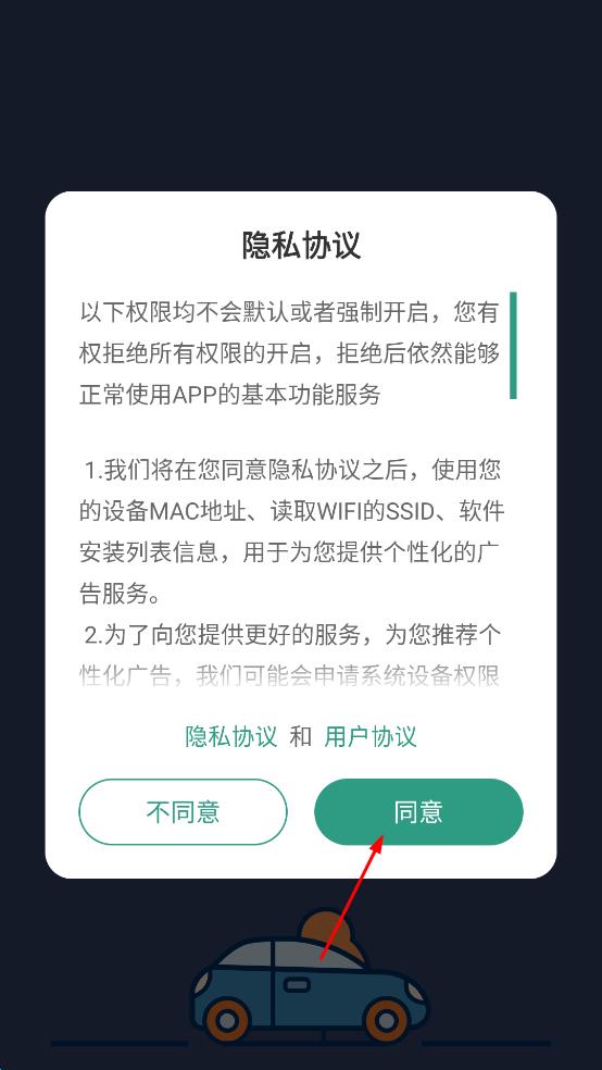 1、打開該自動化操作類APP,在隱私協(xié)議界面,仔細閱讀相關(guān)內(nèi)容后,點擊同意,進入APP主界面。