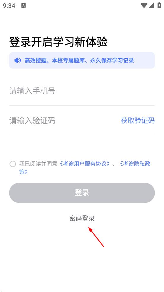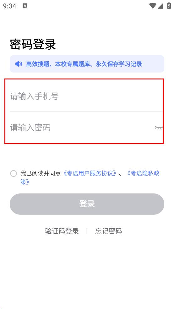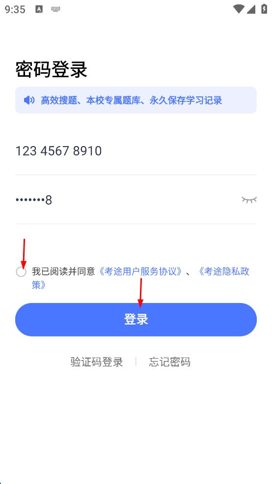 4、輸入完成后,勾選“我已閱讀并同意考途用戶服務(wù)協(xié)議,考途隱私政策,然后點(diǎn)擊“登錄”按鈕,即可完成密碼登錄流程。