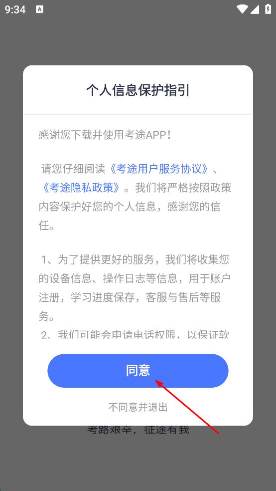 1、打開考途APP,會彈出個人信息保護(hù)指引彈窗,仔細(xì)閱讀相關(guān)內(nèi)容后,點(diǎn)擊“同意”,進(jìn)入登錄相關(guān)頁面。
