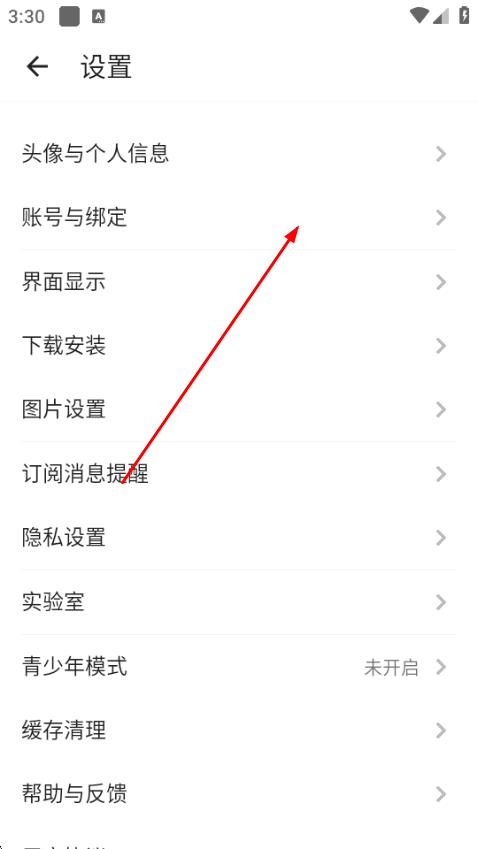 3、進入設(shè)置頁面后,找到并點擊賬號與綁定選項。