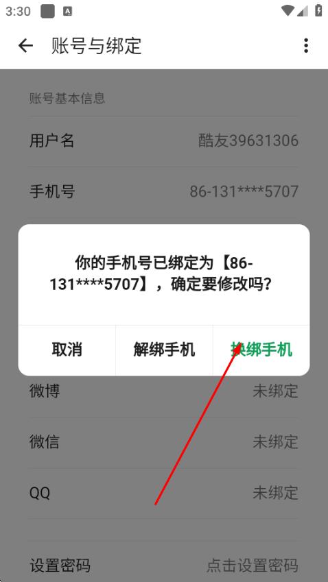 5、在彈出的提示框中,點擊換綁手機,完成手機號換綁操作。