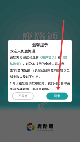 1、在點(diǎn)開鹿路通app后,可以點(diǎn)擊彈窗中的同意按鈕,進(jìn)入使用。