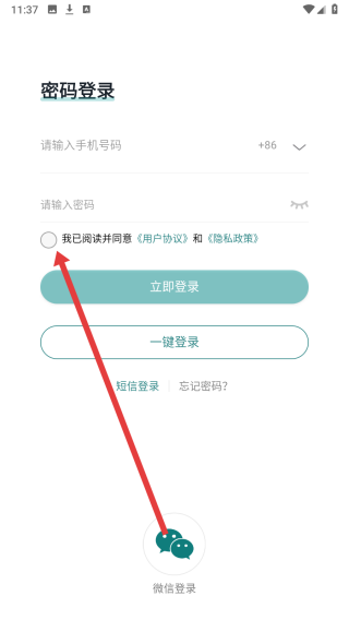 3、在進(jìn)入到密碼登錄頁面時,在登錄前需勾選我已閱讀并同意按鈕。