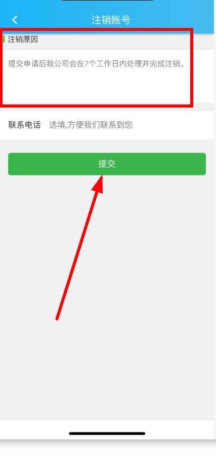 4、進(jìn)入注銷(xiāo)賬號(hào)頁(yè)面后,填寫(xiě)注銷(xiāo)原因,可選擇填寫(xiě)聯(lián)系電話,之后點(diǎn)擊提交,等待公司在7個(gè)工作日內(nèi)處理完成注銷(xiāo)。