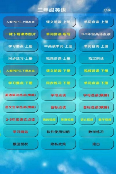 pep三年級(jí)英語(yǔ)上冊(cè)點(diǎn)讀版。離線聽(tīng)讀,不用WIFI。覆蓋了小學(xué)三年級(jí)上冊(cè)英語(yǔ)上冊(cè)所有課文、單詞的翻譯、朗讀。(單詞朗讀有二種模式:純英文讀、中文-英文,方便記憶)