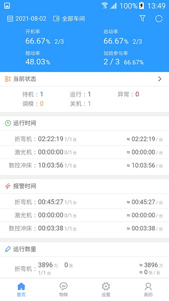 準確的了解各類數(shù)控機床實時狀態(tài)(運轉(zhuǎn)、待機、警報等)、稼動效率和基礎(chǔ)的加工信息。例如:折彎次數(shù)、運行時間、板材張數(shù),激光出光時間,穿孔/沖擊/運行次數(shù)等。各項功能、各品牌數(shù)據(jù)持續(xù)完善中... ...