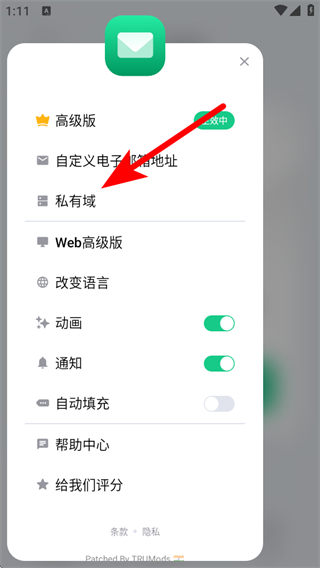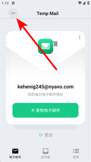 1、在tempmail的主界面,點擊左上角菜單按鈕,展開功能選項列表。