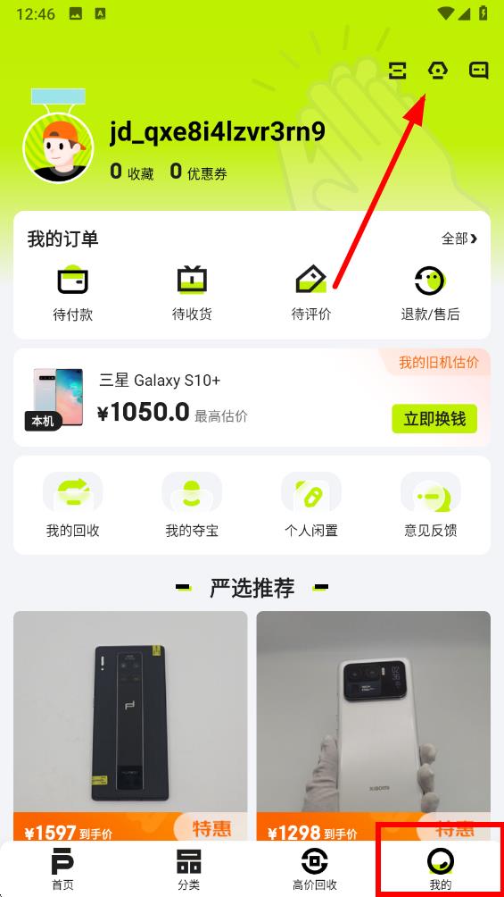 1、打開(kāi)拍拍二手app,點(diǎn)擊底部導(dǎo)航欄中的我的選項(xiàng),點(diǎn)擊頁(yè)面右上角設(shè)置圖標(biāo)。