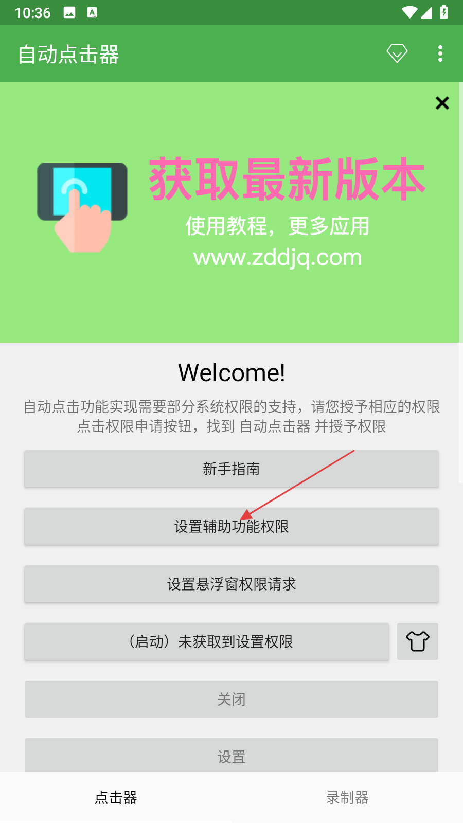 1、打開(kāi)自動(dòng)點(diǎn)擊器,點(diǎn)擊設(shè)置輔助功能權(quán)限,進(jìn)入手機(jī)無(wú)障礙設(shè)置頁(yè)面。