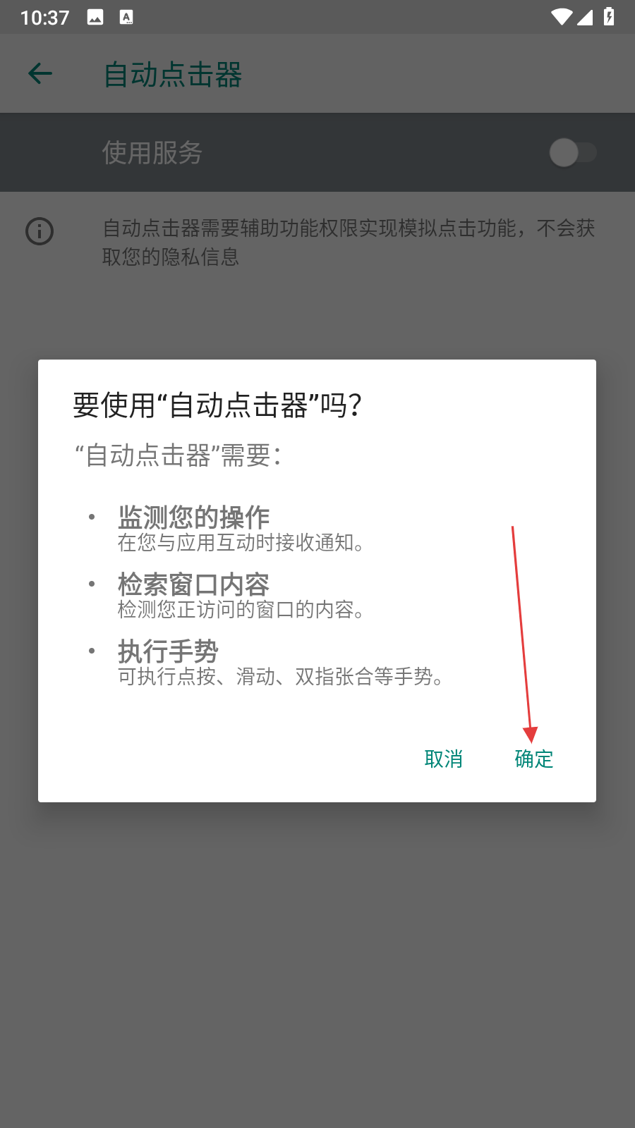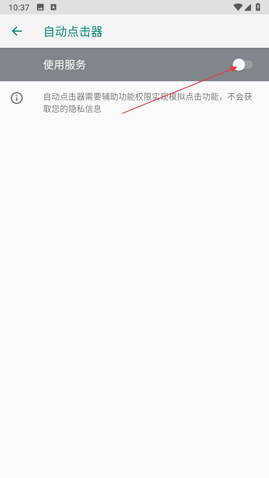 3、在自動(dòng)點(diǎn)擊器權(quán)限頁(yè)面,打開(kāi)使用服務(wù)的開(kāi)關(guān)。