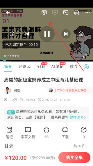 2、進入課程播放頁面,點擊視頻上方類似電視形狀的投屏圖標。