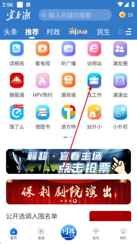 1、打開(kāi)宜春潮App,在首頁(yè)找到并點(diǎn)擊找工作圖標(biāo)。