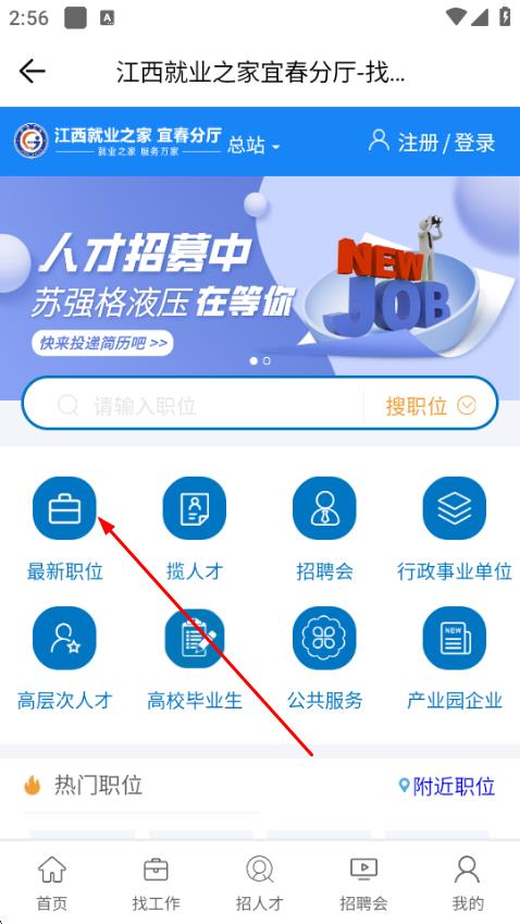 2、進(jìn)入江西就業(yè)之家宜春分廳-找工作頁(yè)面后,點(diǎn)擊最新職位選項(xiàng)。