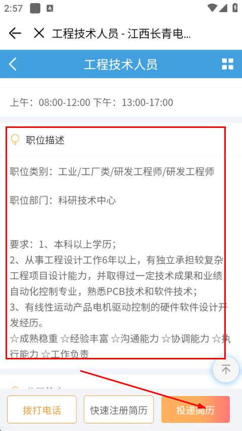 4、進(jìn)入職位詳情頁(yè)面,查看職位描述、要求等信息,可點(diǎn)擊投遞簡(jiǎn)歷按鈕。