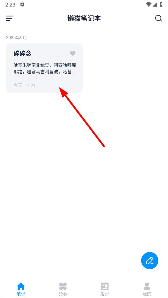 1、打開(kāi)懶貓筆記本app,在筆記頁(yè)面中,點(diǎn)擊需要?jiǎng)h除的筆記內(nèi)容。