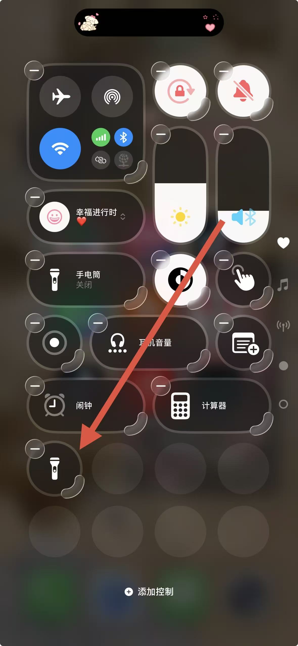 3、點(diǎn)擊手電筒選項(xiàng)對(duì)應(yīng)的添加按鈕,返回控制中心,即可看到手電筒已添加成功。