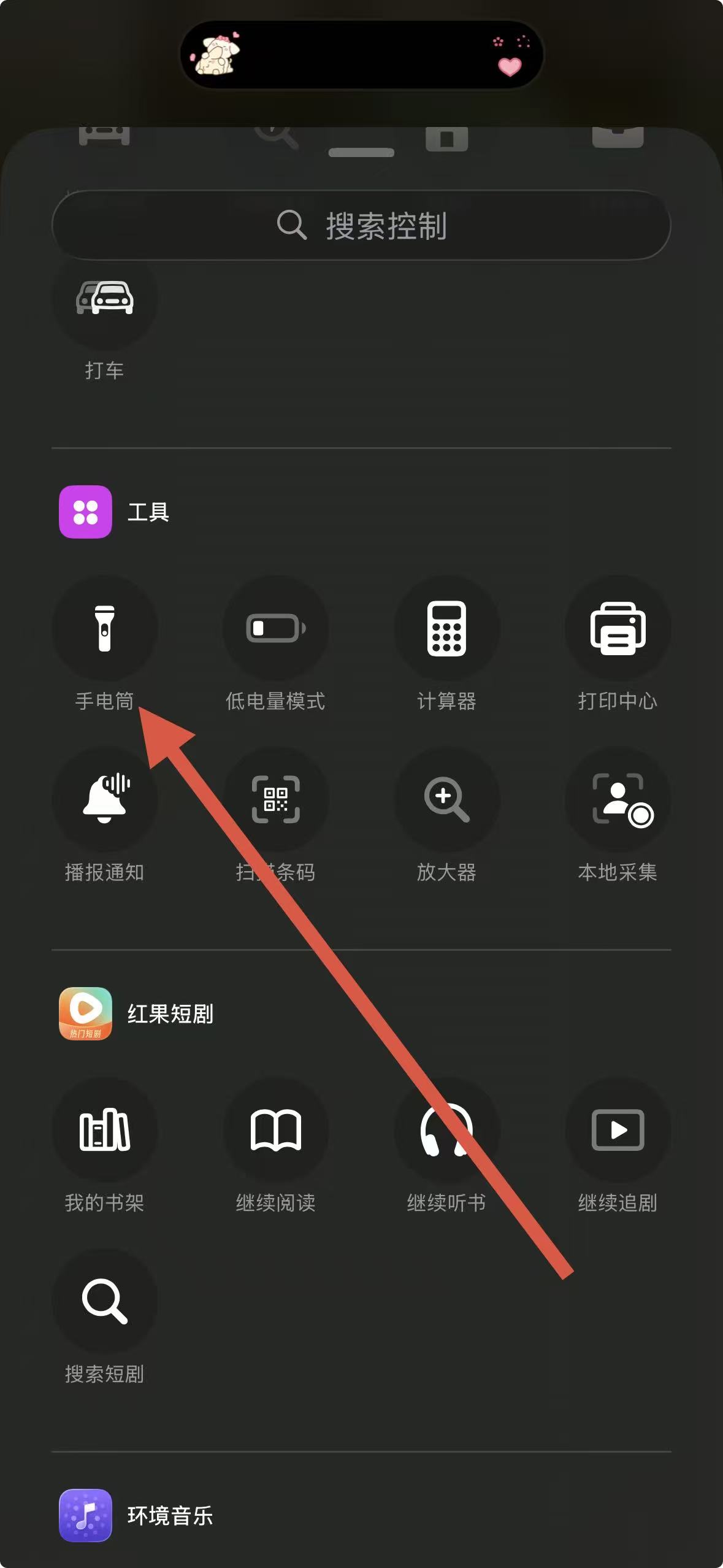 2、在添加控制界面的工具分類下,找到手電筒選項(xiàng)。