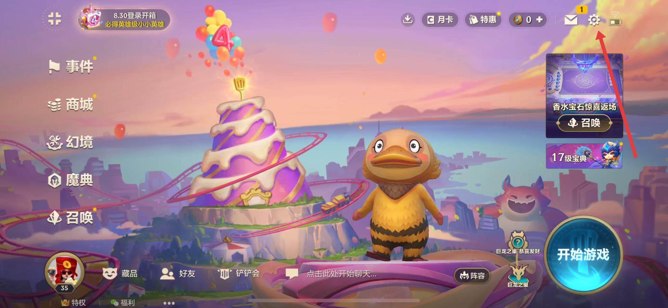 1、打開金鏟鏟之戰(zhàn)游戲,在主界面點(diǎn)擊右上角的設(shè)置圖標(biāo),進(jìn)入設(shè)置頁面。