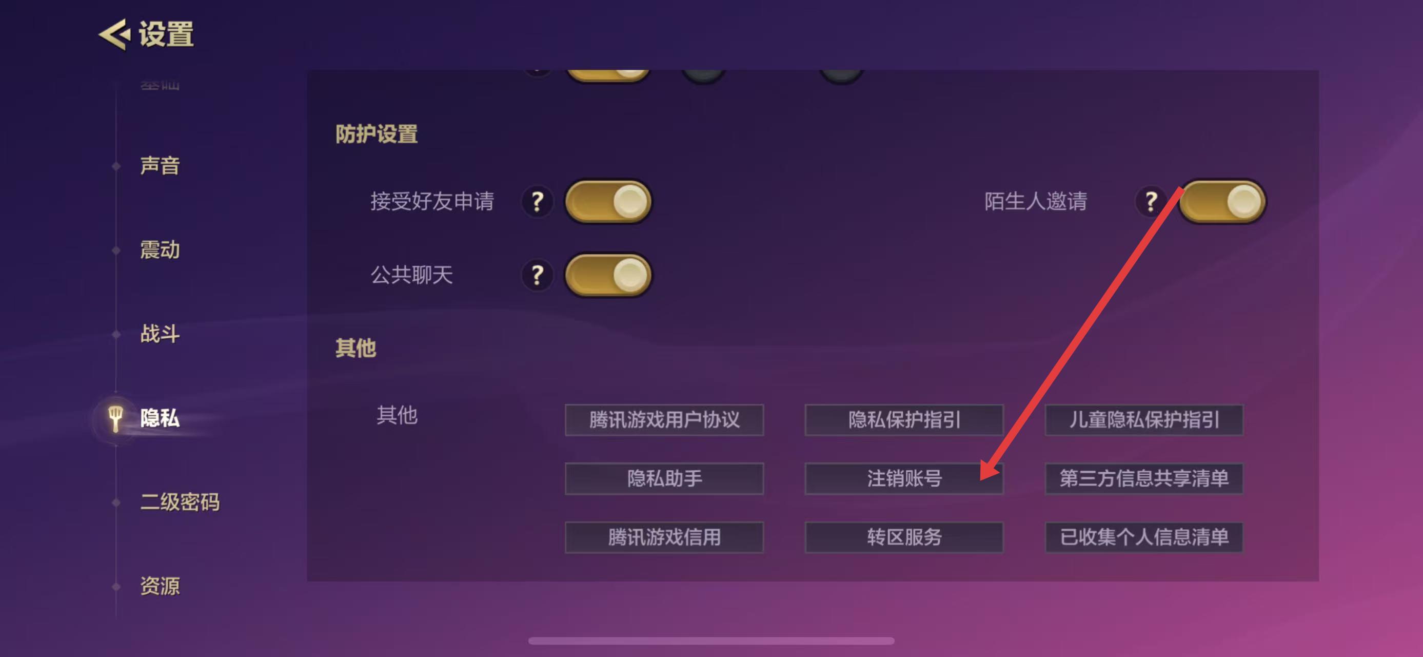 3、在隱私設(shè)置界面的下方“其他”板塊中,找到注銷賬號(hào)按鈕,點(diǎn)擊后按照后續(xù)提示進(jìn)行身份驗(yàn)證、確認(rèn)賬號(hào)信息等操作,即可完成游戲賬號(hào)注銷。