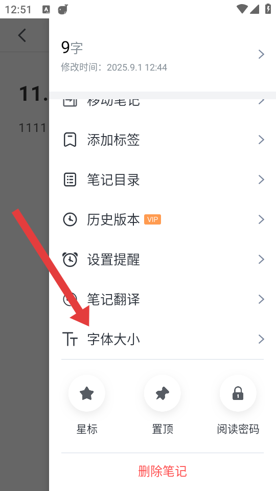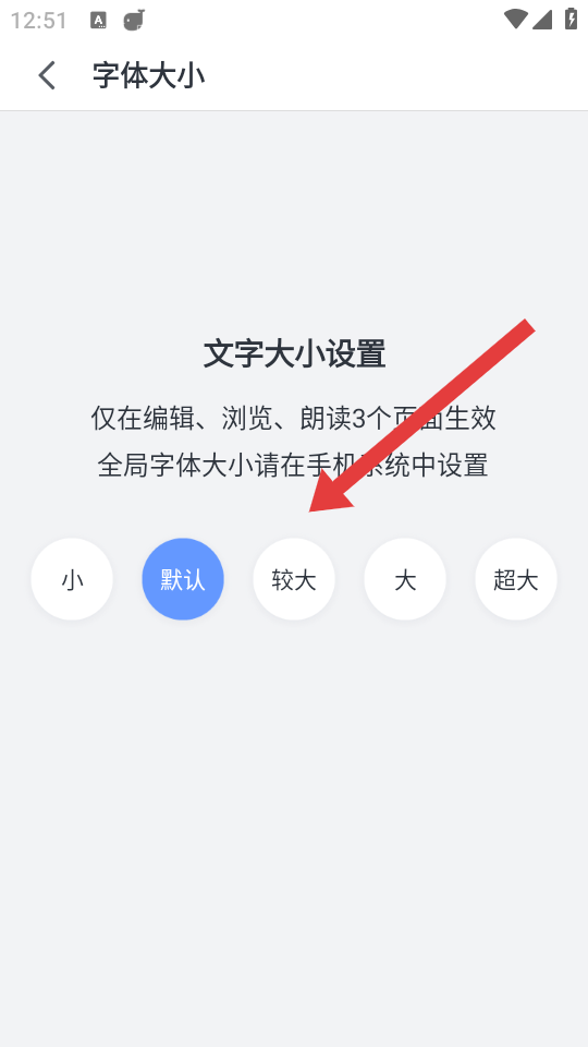 3、在文字大小設(shè)置的頁(yè)面,選擇小、默認(rèn)、較大、大、超大中的任意一個(gè)選項(xiàng),即可調(diào)整筆記字體大小。