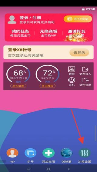 1、啟動X8沙箱APP,在首頁內(nèi)點擊右下角沙箱設置的功能。