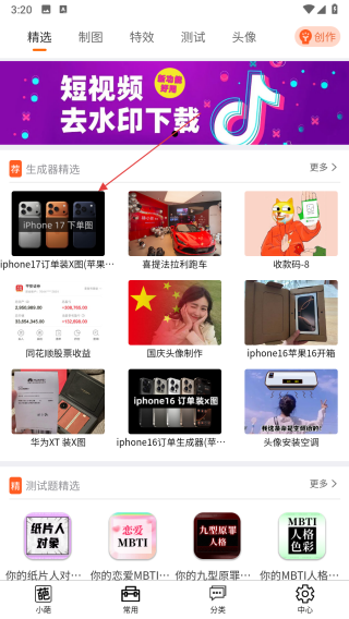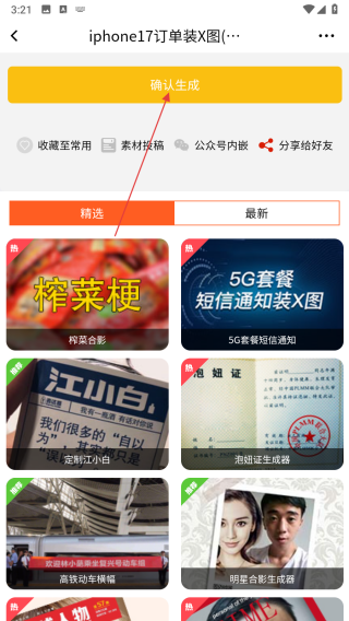 1、打開嗨小葩APP,在首頁的生成器精選區(qū)域中,選擇需要制作的圖片模板,進入模板編輯頁面。