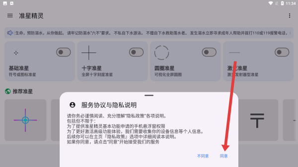 1、打開準(zhǔn)星精靈后,彈出服務(wù)協(xié)議與隱私說明彈窗,可以通過點擊同意,進(jìn)入應(yīng)用主界面使用功能。