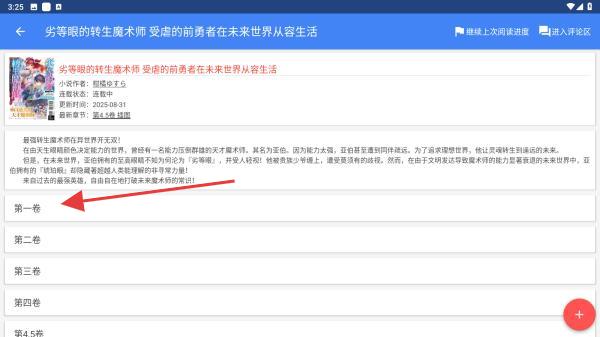 2、進(jìn)入小說(shuō)詳情頁(yè)后,點(diǎn)擊目標(biāo)卷數(shù),展開(kāi)該卷的章節(jié)列表。