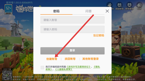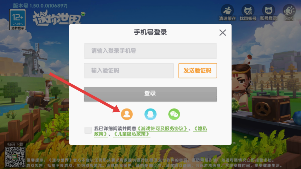 1、在進(jìn)入到迷你世界后,可以在登錄窗口中點(diǎn)擊人形圖標(biāo)切換登錄方式。