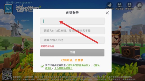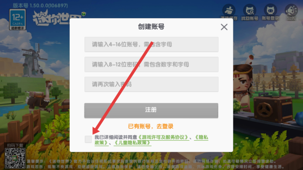 4、在勾選好同意按鈕后,點(diǎn)擊上方輸入框依次輸入賬號(hào)和密碼后,即可完成注冊創(chuàng)建。