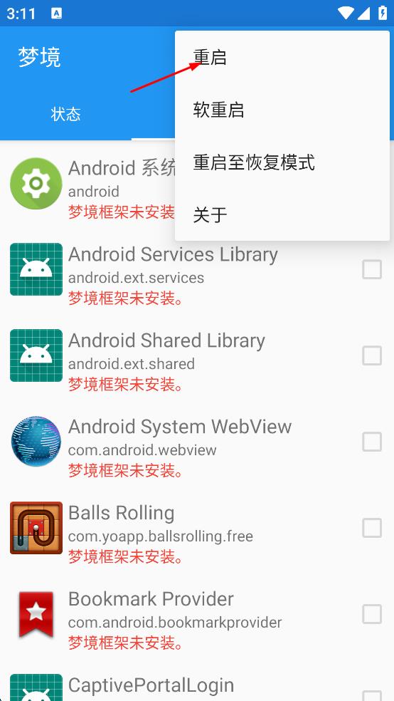 4.安裝夢境app,管理夢境和xp模塊的,同xpinstaller類似,重啟手機(jī)后再進(jìn)入夢境app,顯示綠色√就表示夢境安裝好了;